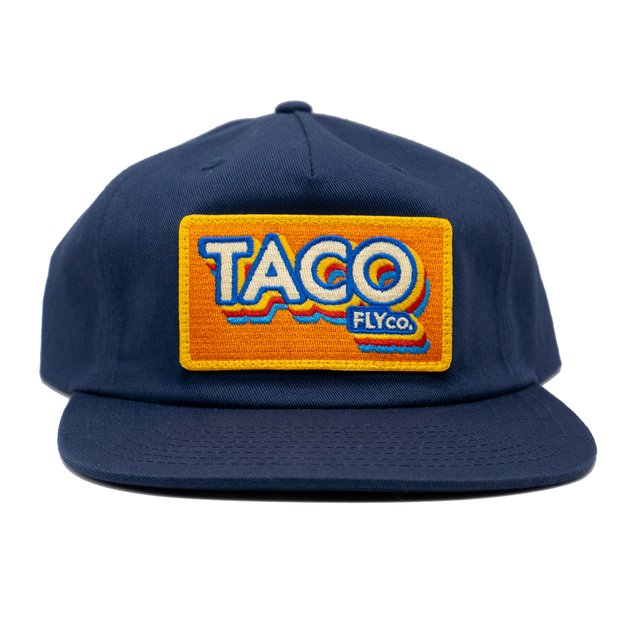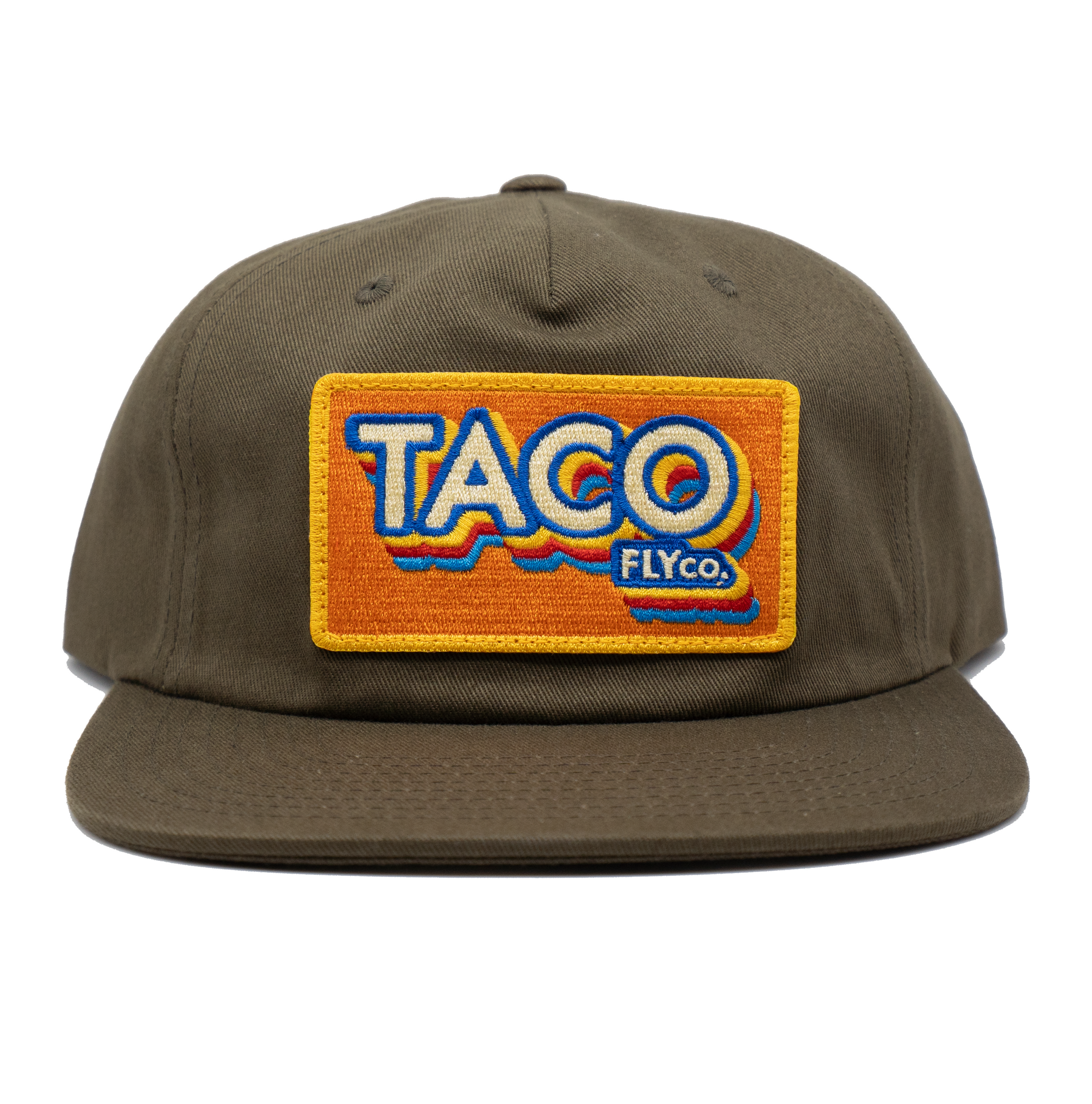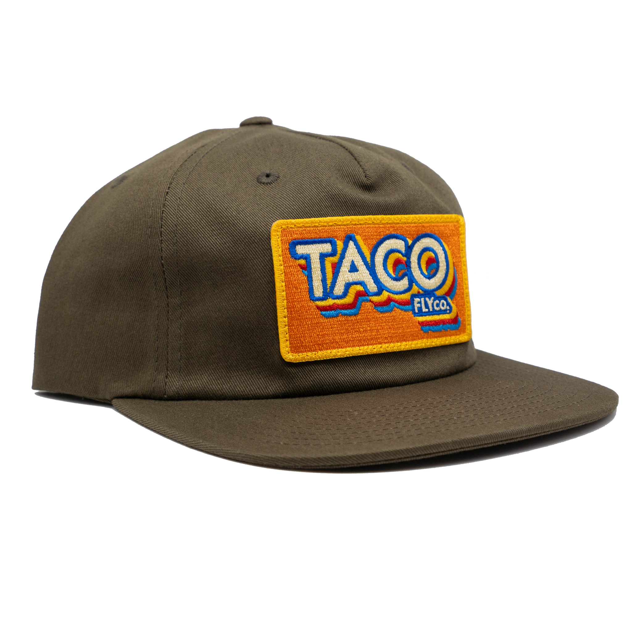 A tasty Cotton, Unstructured, Pinch Front 5 Panel, Flat Bill, with a Premium Leather Strap with Brass Clasp.